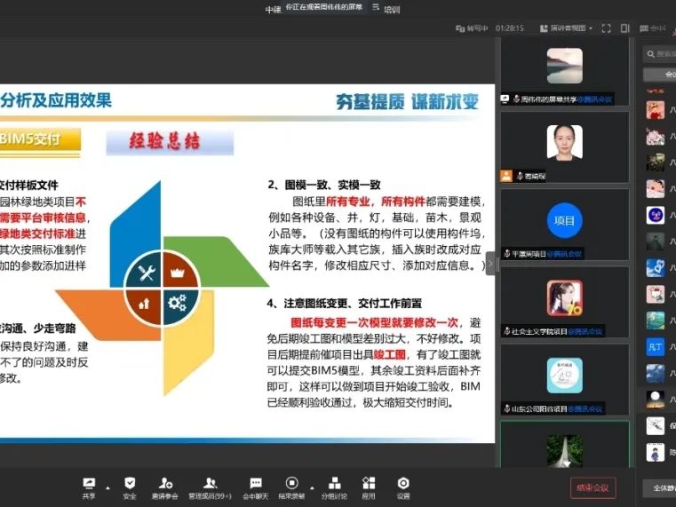 本次培训采用线上腾讯会议形式,参会人员积极互动,围绕BIM技术在设计优化、施工模拟、运维管理等环节的应用展开深入探讨,为提升全局项目数字化履约能力提供了有力支撑。