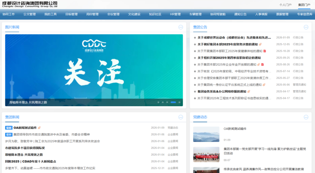 以市人防院为试点,开展第三代信息系统建设。融合OA办公平台与专属AI助手,构建人防设计院业务全流程数智办公体系。其中,OA平台实现了项目管理、综合管理、人事管理、财务管理、流程审批全线上化,切实提升行政办公与项目管控效率,筑牢数据安全底座。