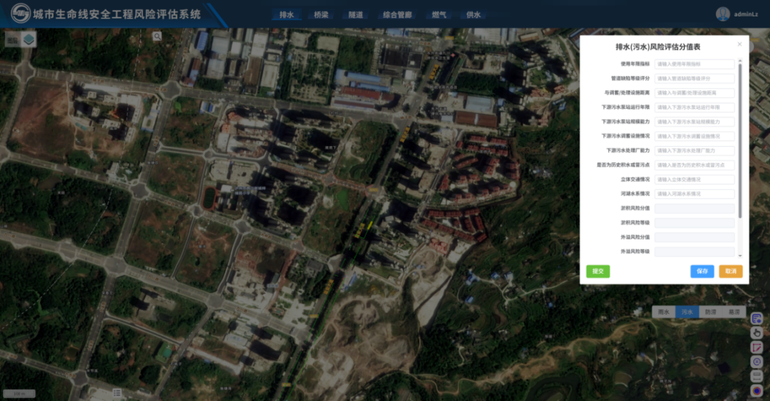 该系统集成城市基础设施、物联感知、城市综合管理等多维度数据,设计适配燃气、供水、排水、桥梁、隧道、综合管廊等行业领域技术标准的智能化评估算法,一键自动完成风险评分、定级与风险图生成,通过数据地图高效完成点、面层级的精细调整,实现城市市政基础设施的健康体检。适用于各类城市生命线基础设施的风险评估、分析工作。
