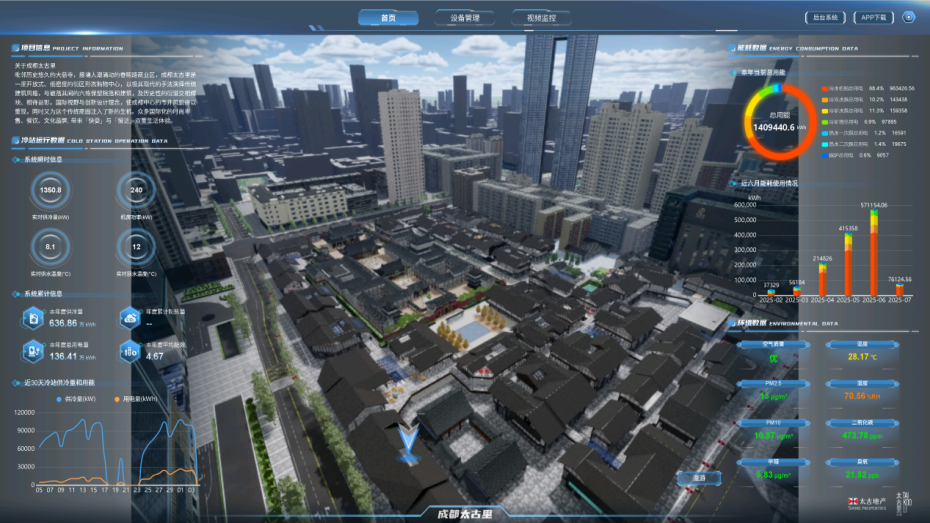 建设“1个展示大屏”以直观的三维界面展示太古里全景和冷站布局;“1个数据中台”对接系统数据及抄表、维保、交接班数据;“1个移动端”实现抄表、交接班等功能。实现“2项三维功能”:三维设备管理、三维巡检;“3项管理功能”:维保商管管理、交接班管理、抄表系统管理。